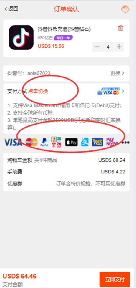第三步,选择适合自己的支付方式进行支付即可,“点击切换”可以更换支付不同的支付方式,比如直接用卡支付的通道就有几个,另外kavip还支持本地支付, 美国抖音充值常用paypal, 台湾抖音充值台湾超商,香港常用的香港alipay,新加坡常用的paynow, grabpay,以及马来西亚常用的FPX和TNG等本地支付。