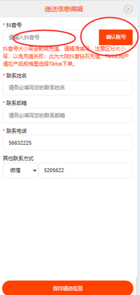 第二步,填写自己的抖音ID,在您的抖音账户里面查找,并复制到递送信息这里,点击确认账号可以帮助您校对账号的准确性,如果不对就请重新返回您的抖音账户核对,避免充值错误。因为抖音都是直接匹配ID自动充值,一旦发货无法撤回。