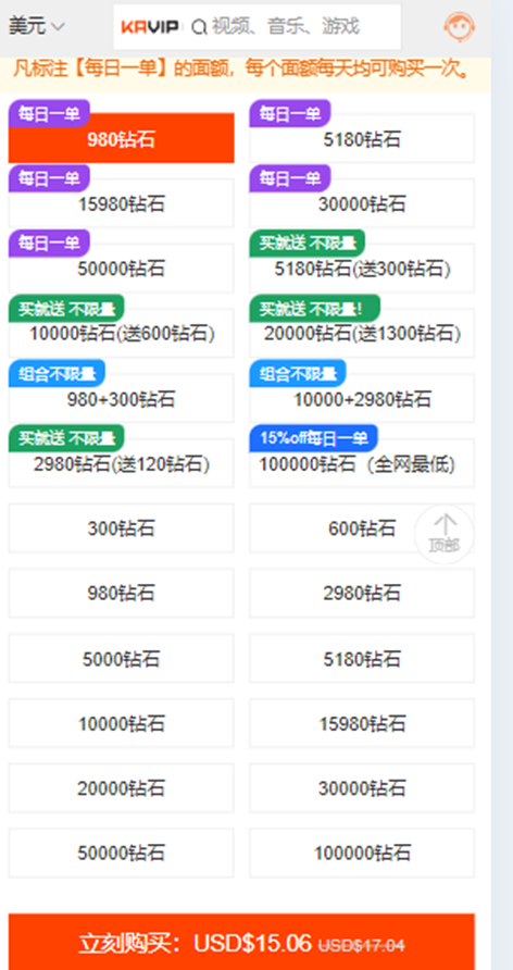 第一步:通过链接 www.kavip.com进入网站,首页就直接有抖音充值快速下单,这里有很多特价,其中最划算的是“每日一单”的规格,基本上相当于日常活动的8%优惠券,所有标记了“每日一单”的规格都可以每天购买,所有的每日一单下完后,如果还不够充值,可以选择“15%off每日一单全网最低”的10W抖币规格,这个也是非常便宜,其次就是“买送”和“组合特价”,这两个标签的规格都是直接降价了,不需要使用任何折扣码都直降,降价幅度相当于优惠券6%;