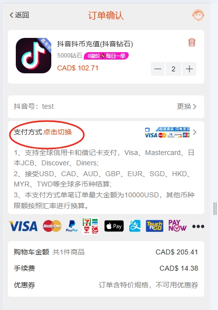 3. 选好规格后,跳转到购物车,点击“支付方式切换”选择自己适合的支付方式付款,加币可以用卡直接支付或者paypal或者apple pay支付,非常便捷。付款后,最快发货时间20S内,都是抖音充值官方API自动发货,秒到账。